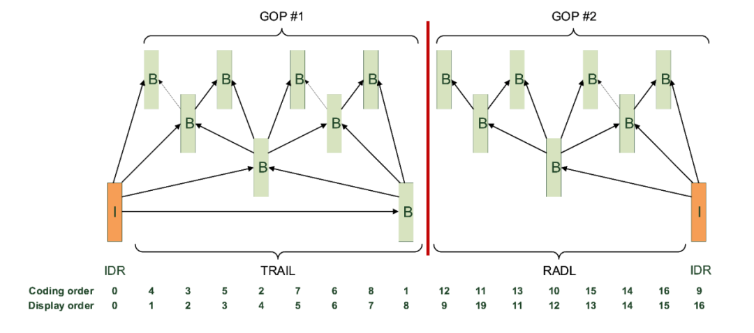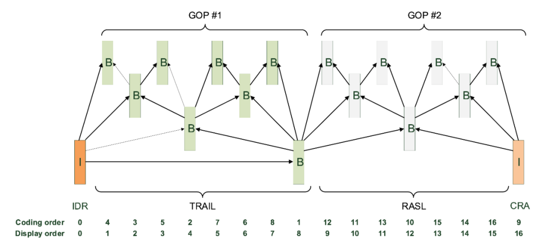研究表明,将图片重新排列到所谓的GOP中以获得分层参考结构可以提供一些显著的编码效率增益。图1显示了有8张图片的两个这样的GOP的示例。GOP#2的图片没有参考来自先前GOP#1的图片。这种时间参考结构的中断被称为闭合GOP。在随机访问的情况下,来自GOP#2的最后I帧和所有先前B帧可以独立于来自GOP#1的先前帧而被解码和显示。