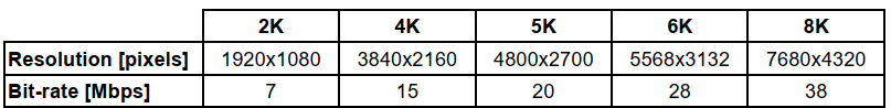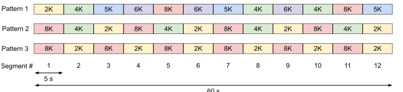 为了测试结果的可再现性,创建了预配置的格式副本,模拟具有多个分辨率开关切换的场景。特别地,Spin Digital VVC实时编码器被配置为使用受约束的开放GOP、intra-period为1s和恒定比特率(CBR)控制。使用这些编码设置,视频序列首先以不同的分辨率(2K、4K、5K、6K、8K)和比特率进行编码(见表4),并打包成每个5秒的HLS段。