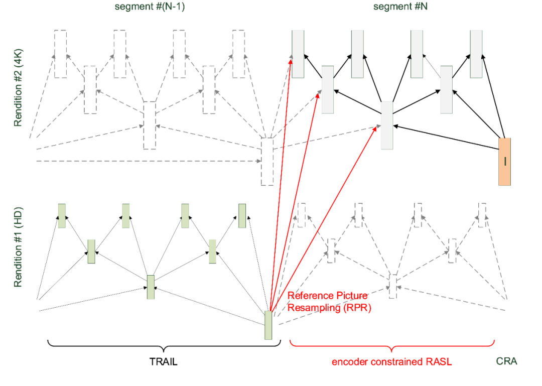在上一节中,已经解释了开放GOP方法的好处以及它不用于自适应流的原因。为了在自适应流中的切换点启用开放GOP,最新的VVC标准使用了名为参考图片重采样(RPR)的工具。这个工具与编码器约束相结合,实现了自适应流中的开放GOP。