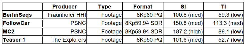 VVC编码器的新功能已在非正式主观测试中进行了验证。在这项测试中,使用了四个1分钟的8K(7680x4320,10位,60帧/秒)视频剪辑。表3显示了关于测试片段的详细信息,其中还规定了它们在空间和时间信息(SI,TI)方面的时空特征,这两个信息在ITU-R BT.500中定义。