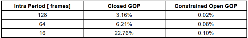 如表2所示,比较的基线是无约束的开放GOP编码,与所使用的intra-period无关,约束开放GOP编码导致相对于开放GOP编码的最小BD-rate损失(高达0.10%)。另一方面,正如预期的那样,封闭GOP编码在所有情况下都会产生BD-rate损失。例如,对于64帧的intra-period,BD-rate增加为6.21%。由于编码视频中闭合GOP的存在增加,压缩效率的损失随着intra-period的减少而变得更加显著。最坏的情况发生在intra-period具有与GOP相同的大小(即16帧)时,其中BD-rate损失甚至可以超过20.0%。