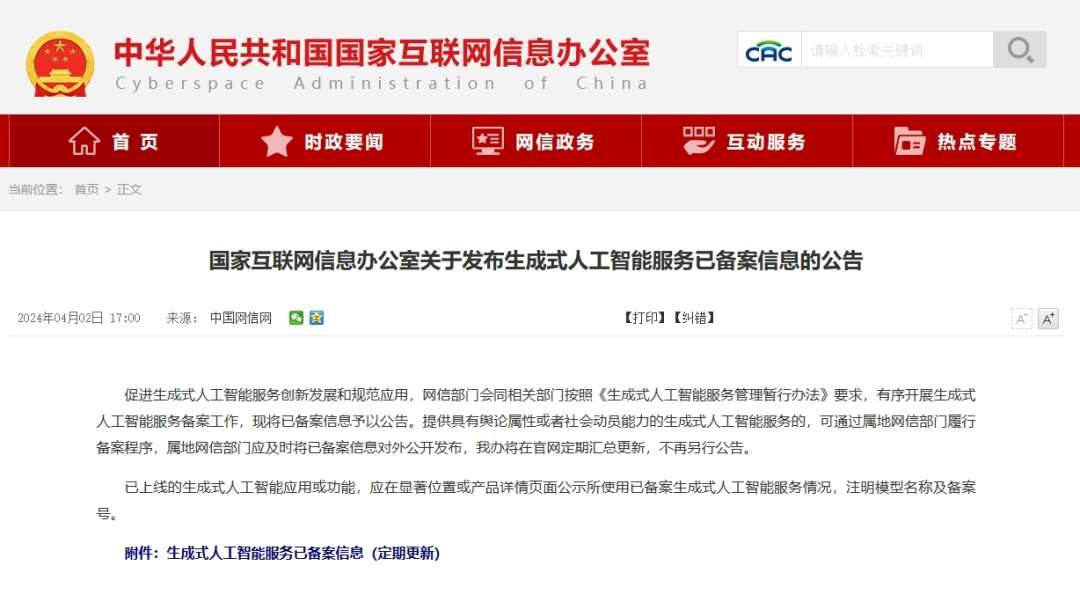 4 月 2 日,国家网信办官网发布了关于《生成式人工智能服务已备案信息的公告》。