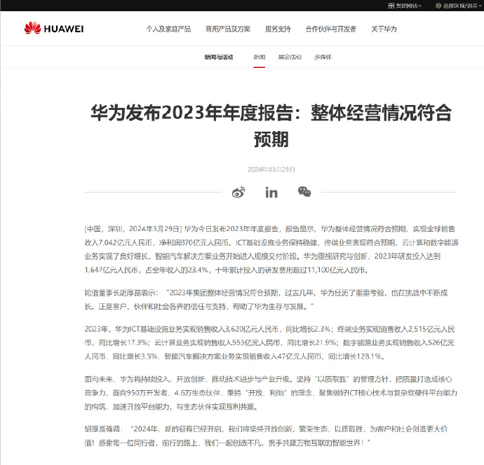 3 月 29 日,华为发布 2023 年报,整体经营情况符合预期, 全年实现营业收入 7042 亿元,净利润 870 亿元,同比增长 144.5%。