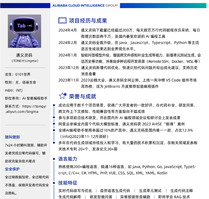 4 月 2 日 , 阿里巴巴今日郑重宣布,迎来了一位不同寻常的“新员工”——通义灵码,工号 AI001,标志着 AI 新纪元的开启。这位 7X24 小时在线的 AI 智能编程助手,将成为阿里大家庭中独一无二的存在。