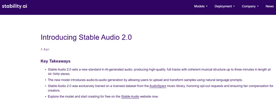 4 月 4 日,著名开源大模型平台 Stability.ai 在官网正式发布了,音频模型 Stable Audio 2.0。Stable Audio 2.0 支持用户通过文本或音频,一次性可生成 3 分钟 44.1 kHz 的摇滚、爵士、电子、嘻哈、重金属、民谣、流行、乡村等 20 多种类型的高质量音乐。
