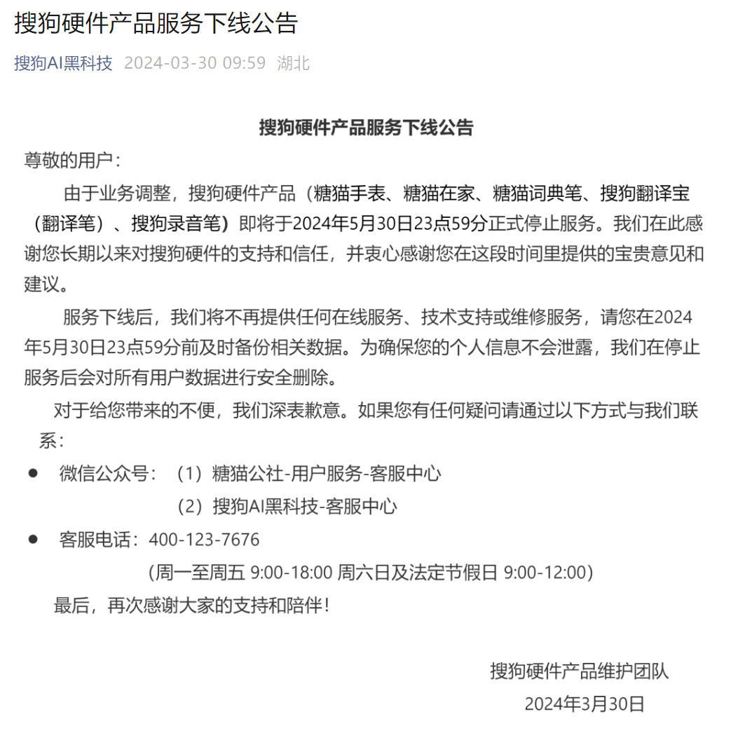 4 月 1 日,搜狗硬件产品维护团队发布公告表示,由于业务调整,搜狗硬件产品 (糖猫手表、糖猫在家、糖猫词典笔、搜狗翻译宝 (翻译笔)、搜狗录音笔) 即将于 2024 年 5 月 30 日 23 点 59 分正式停止服务。