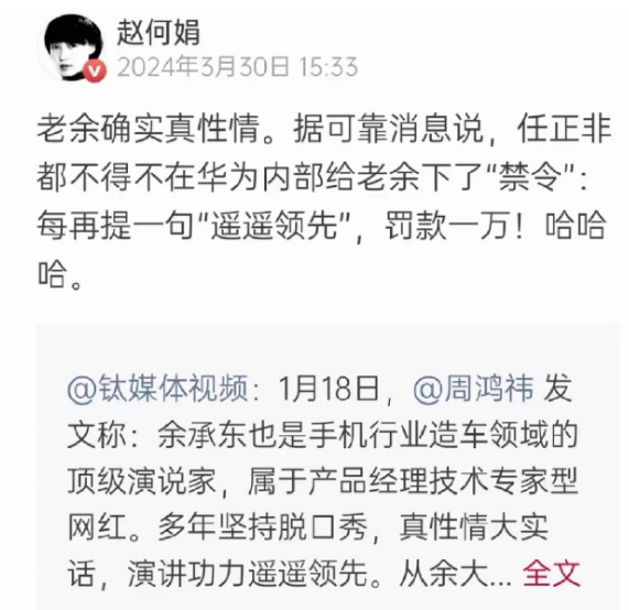 4 月 2 日,# 余承东否认被下令禁提遥遥领先 # 冲上热搜。据悉,有媒体发文称,任正非据传下禁令一句遥遥领先罚款一万,相关话题引发关注。3 月 30 日,钛媒体创始人赵何娟发文称,据可靠消息说,任正非在华为内部给余承东下了“禁令”,每再提一句“遥遥领先”罚款一万。