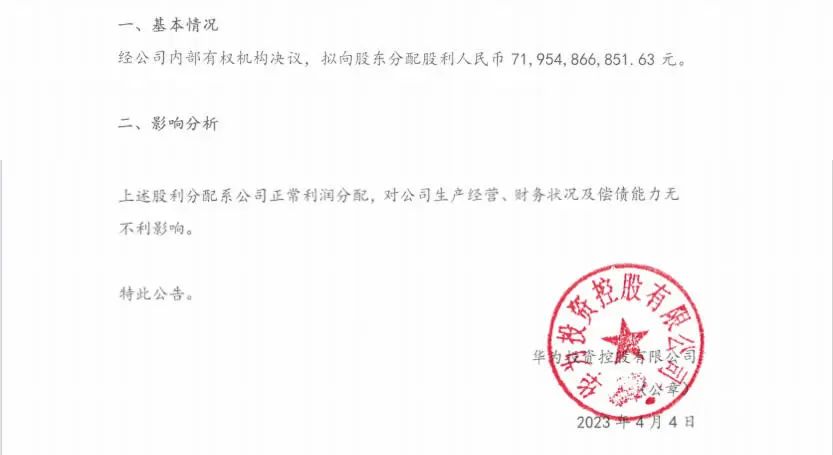 4 月 4 日,又更新发布华为投资控股有限公司关于分配股利的公告,拟向股东分配股利人民币约 719 亿元