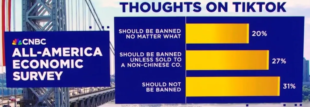 目前,在美国民众中,对于是否应该禁止 TikTok 的看法存在显著的分歧。根据 CNBC 的一项民意调查,31% 的受访者认为不应该禁止 TikTok,而只有 20% 的受访者支持无条件禁止。这一数据反映出,对于 TikTok 所代表的言论自由和“创造者经济”的支持,并不是少数声音。