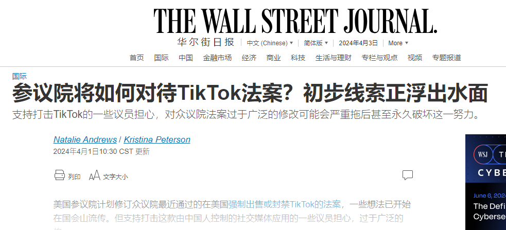 在美国国会官网和长期跟踪美国国会活动的 GovTrack 上查询“TikTok 法案”,均未显示参议院对该法案有任何进一步的审议计划或时间表。华尔街日报报道称,复活节休会归来后,参议院商务委员会主席玛丽亚‧坎特韦尔可能将推动该法案的修改。这意味着,该法案可能会被暂缓审议或彻底无法生效。