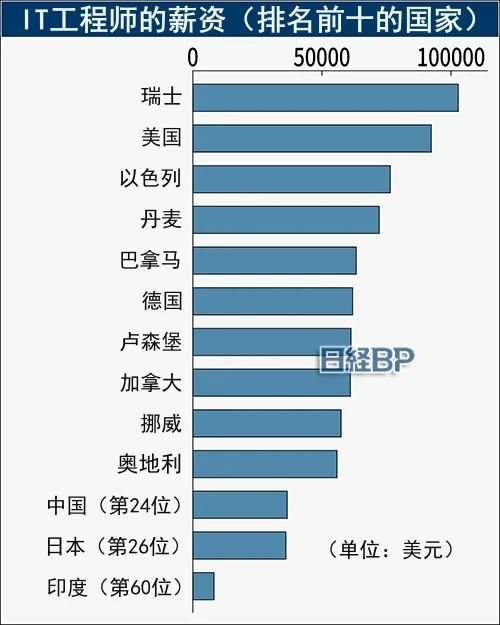 在薪水方面,瑞士的 IT 工程师薪水最高,其次是美国、以色列、丹麦、巴拿马和德国,中国超过日本排在第 24 位。2023 年中国 IT 工程师的平均年薪为 3.6574 万美元,日本为 3.6061 万美元。分析师称,日本 IT 工程师薪水低的原因是多层转包结构。