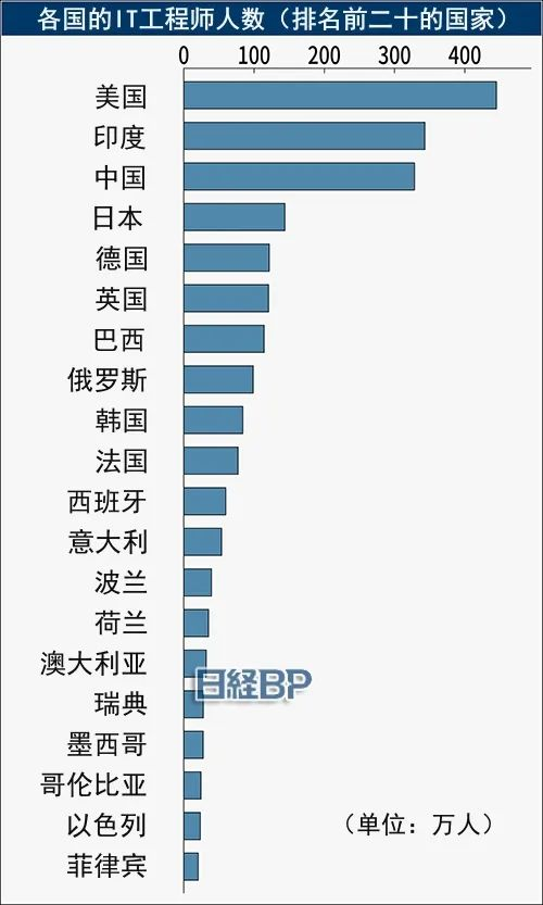 Human Resocia 公布的报告显示,美国以 445.1 万 IT 工程师高居第一,印度 343.1 万第二,中国 328.4 万第三,日本 144 万人第四,但与前三相差甚远。