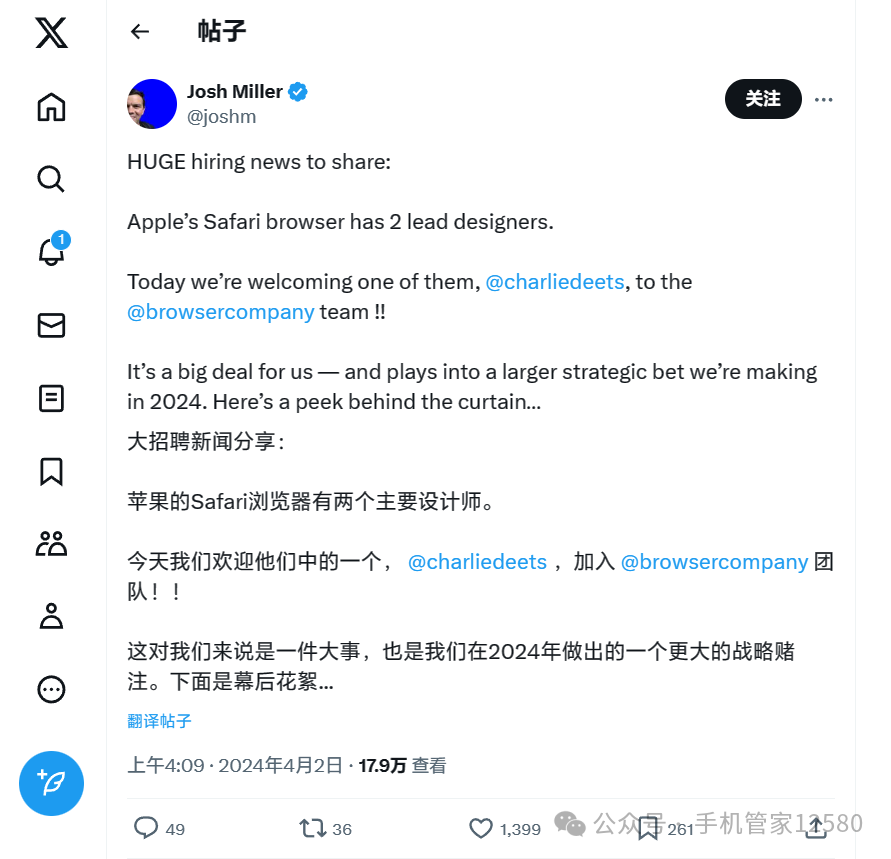 4 月 2 日,苹果公司 Safari 浏览器的主要设计师之一 —— 查理・迪茨现已离开苹果公司,加入 Arc 浏览器背后的 The Browser Company,后者 CEO 乔什・米勒今日凌晨通过 X(推特)宣布了这一消息。