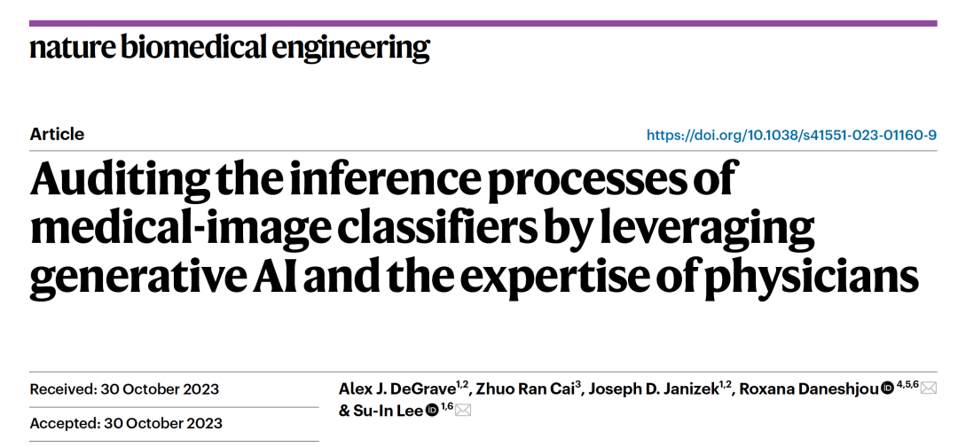 DeGrave, A. J., Cai, Z. R., Janizek, J. D., Daneshjou, R., & Lee, S. I. (2023). Auditing the inference processes of medical-image classifiers by leveraging generative AI and the expertise of physicians. Nature Biomedical Engineering, 1-13.