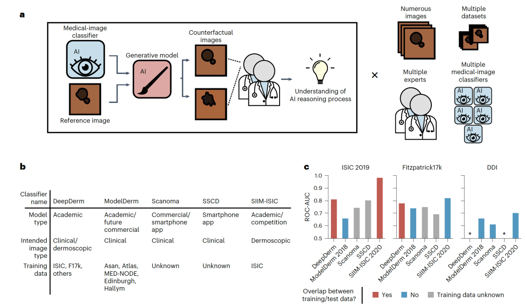 在这项工作中,作者仔细审查了许多备受关注的皮肤病学AI模型,以获得医学图像AI推理过程的医学可解释图片。在这个过程中,作者展示了工作流程,它将XAI与人类领域专业知识相结合(图1a)。作者展示了解决XAI在成像领域的几个严重实际问题的解决方案,包括(1)以医学有意义的术语概念化AI行为,(2)解决采样挑战以形成稳健的结论,以及(3)从对个别预测的解释扩展到对AI分类器推理过程的全球理解。在较高层次上,作者的工作流程涉及基于生成式AI的反事实图像合成,这绕过了医学图像分析中事实上标准的XAI模式(显著性图)的限制。在这里,作者将反事实定义为回答“哪些现实的改变会引发AI做出不同预测?”的图像。作者限制改变程度使得图片看起来很真实,以便医学专家可以解释反事实图像之间的差异。工作流程涉及通过皮肤病学专家对成千上万这样的反事实图像进行分析,以用人类能理解的医学术语描述AI分类器。在整个过程中通过检查大量图像、考虑多个数据集并通过随机分析独立地从两位皮肤科医生那里征求见解,强调严谨性,以减少采样和偏差问题。