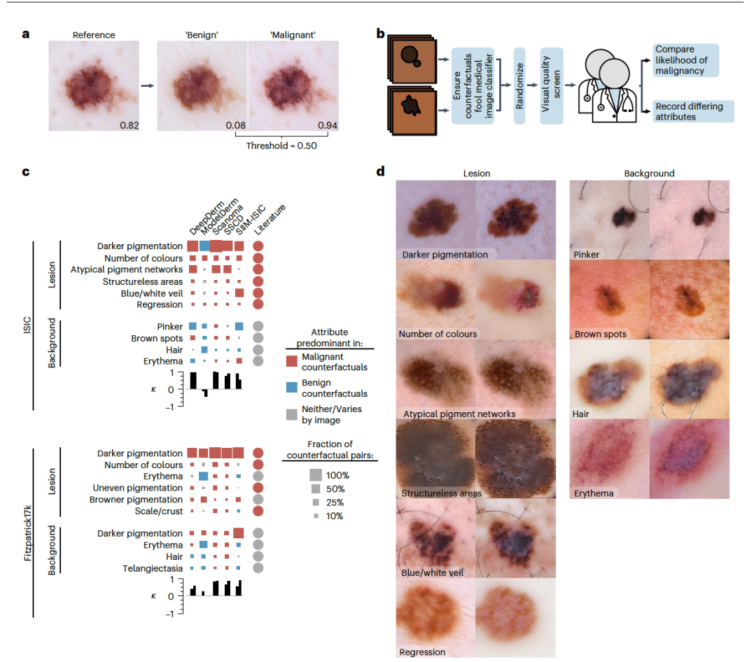 为了理解AI分类器的推理过程,作者通过一个XAI工具检查了每个AI分类器:生成反事实图像。反事实图像通过改变参考图像的属性来生成一个会引发AI分类器给出不同预测的相似图像,从而揭示了AI分类器决策的基础。例如,考虑一个AI分类器预测一个病变是恶性的,而一个被AI分类器预测为良性的反事实图像的不同之处在于它具有较轻、更均匀的色素沉着和背景皮肤上较少的棕色斑点;只要我们确保反事实中的所有差异都推动AI分类器的预测朝着期望的方向(更良性)就可以推断出分类器使用病变的较深色素沉着和背景皮肤上的棕色斑点作为其推理过程的一部分(图2a)。为此,作者改进并应用了先前开发的一种生成反事实图像的技术,即通过渐进式变化来解释模型。在皮肤病学AI分类器的背景下,这项技术使从参考图像生成“良性”和“恶性”反事实图像成为可能(图2a)。作者训练了一个生成式AI模型与一个AI分类器,使得生成模型学会如何改变图像以改变AI分类器的预测,该生成模型创建相似且看起来真实但与参考图像不同以引发AI分类器期望预测的反事实图像。