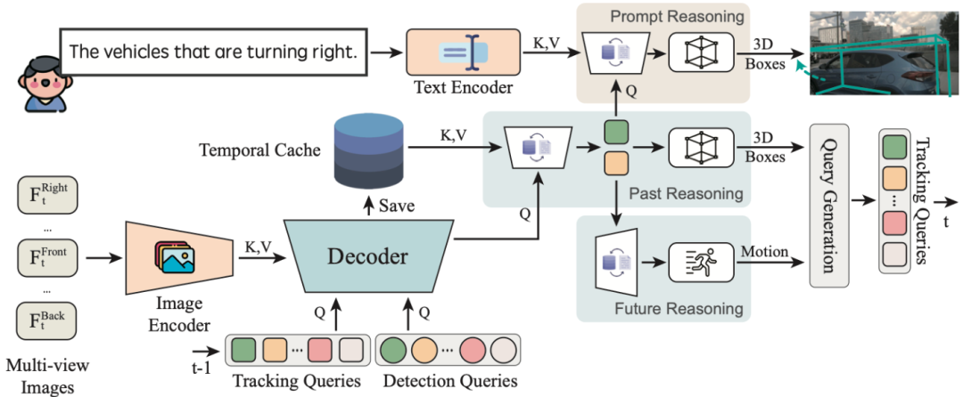 在上图PromptTrack模型中,多个传感器图像会被发送到Encoder-Decoder网络中,通过该网络可以预测对象注释(如3D边界框和注意图),然后结合LLM提示“找到正在右转的车辆”,接着下一个块会找到 3D 边界框定位,并使用二分图匹配算法分配 ID。