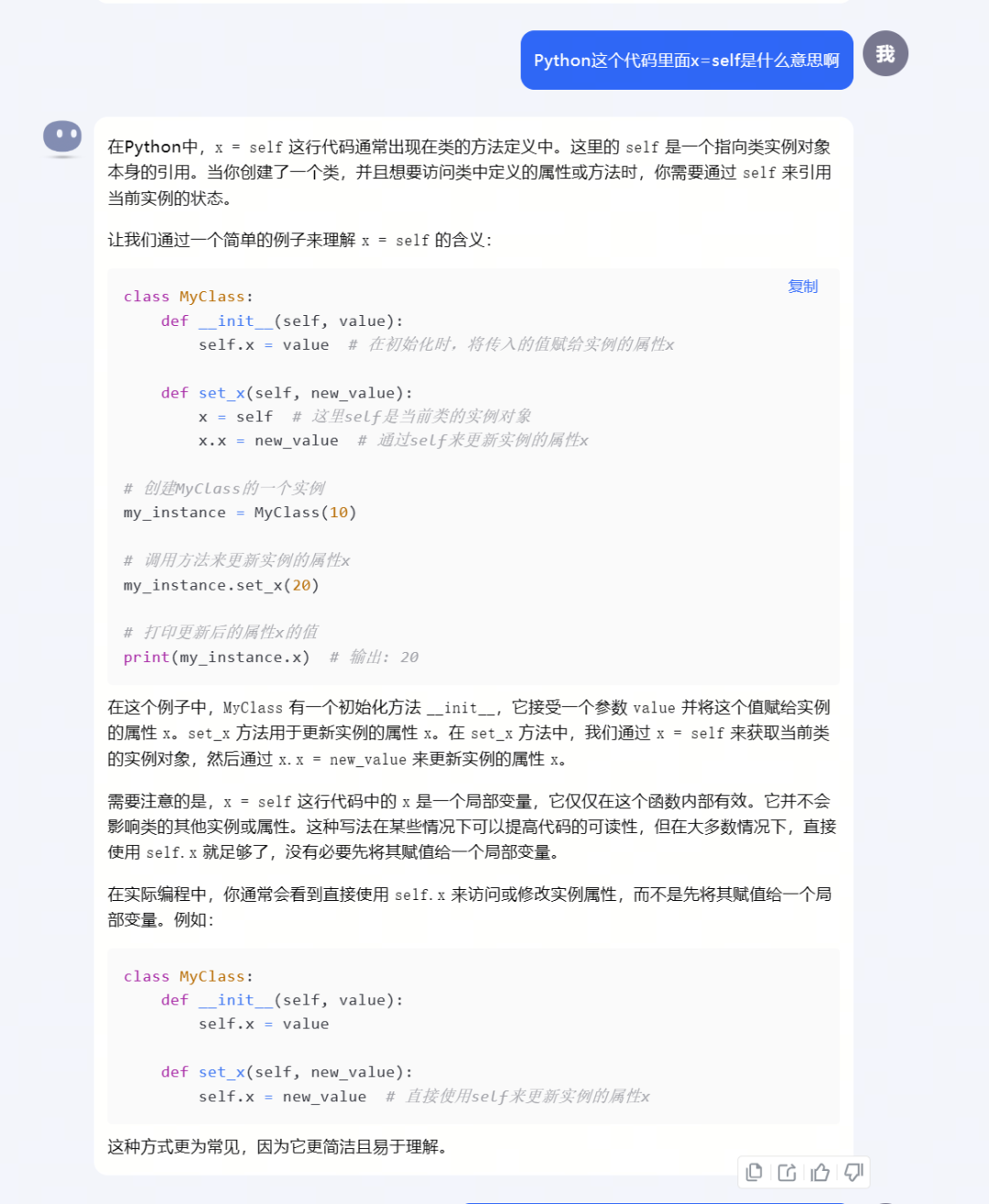 前几天在Python白银交流群【无敌劈叉小狗】问了一个Python基础的问题,问题如下:这个代码里面x=self是什么意思啊?self到底是个什么存在呢?感觉把类本身赋值给x这个点有点抽象。