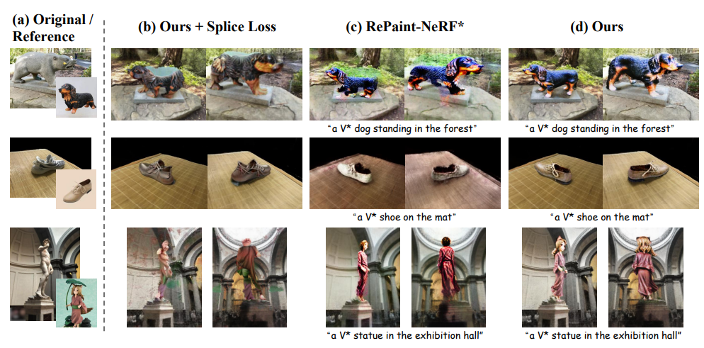 此外,图像驱动3D场景编辑中存在着加剧的几何不一致问题。因为经过参考图像微调过的扩散模型,在推理过程中倾向于产生和参考图像视角相近的图像,造成编辑后3D场景的多个视角均是前视图的几何问题。为此,该论文设计了一种类引导的正则化策略,在全局提示中使用特殊描述符V*,在局部提示中仅使用类词,以利用预训练扩散模型中包含的类先验,使用更几何一致的方式将新概念注入场景中。