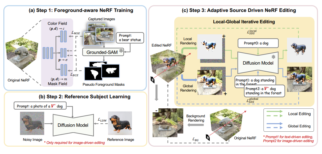 在最终的编辑阶段,由于NeRF的隐式表达,如果使用SDS损失对整个3D区域进行优化会导致背景区域发生显著变化,而这些区域在编辑后理应与原始场景保持一致。如图2(c)所示,该论文提出了局部-全局迭代编辑(LGIE)方案进行解耦合的SDS训练,使其能够在编辑布局区域的同时保留背景内容。