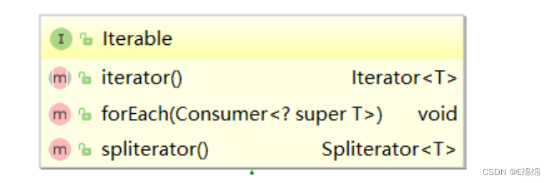 Iterable也是一个接口,表示实现该接口的类是可以逐个元素进行遍历的(可以用该接口去实现遍历) 该接口内部方法具体如下: