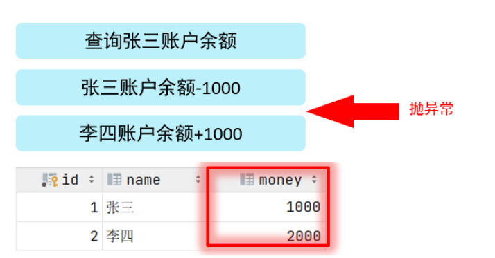 转账这个操作, 也是分为以下这么三步来完成 , 在执行第三步是报错了, 这样就导致张三减少1000块钱, 而李四的金额没变, 这样就造成了数据的不一致, 就出现问题了。