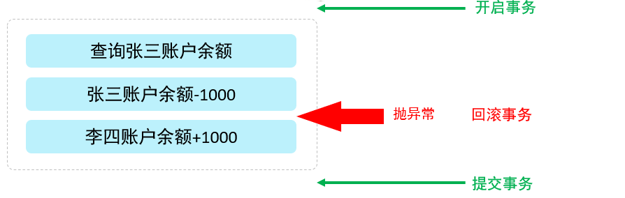 转账这个操作, 需要分为以下这么三步来完成 , 三步完成之后, 张三减少1000, 而李四增加1000, 转账成功 :
