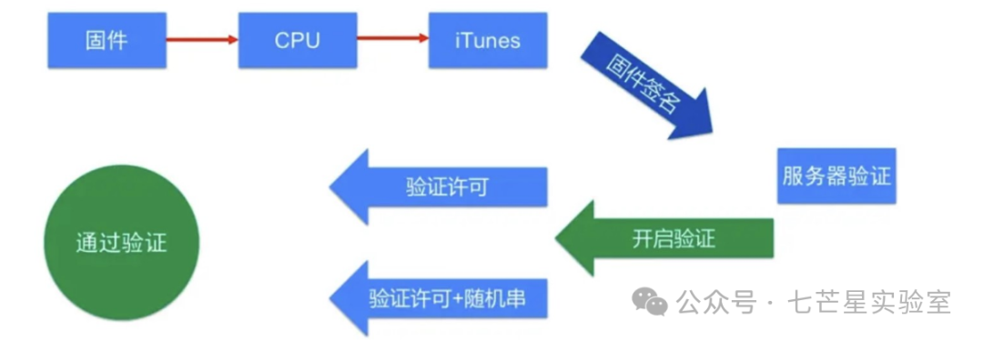 我们的固件要通过CPU刷到手机上面去,CPU在写入我们的固件之前会让iTunes把我们的固件签名发送到服务器,如果服务器开启了验证的话它就会返回,验证许可或者是验证许可加一个随机串,拿到这个验证许可的时候我们才能通过验证,CPU才会真正的把我们的固件刷到手机上面去上面去,如果关闭"开启验证",在早期的版本只会返回一个验证许可,可以通过保存SHSH来欺骗CPU刷入我们的固件