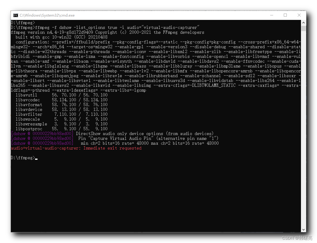 参数 指定输入格式为 DirectShow 多媒体数据的框架 , 在之前的博客中有详细介绍 ;-i video="virtual-audio-capturer"