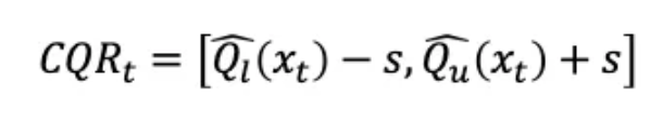 形式上,CQR 根据下面的公式 (2) 调整分位数回归的预测区间。它从下限Ql中减去阈值s,再将阈值s加到上限QU: