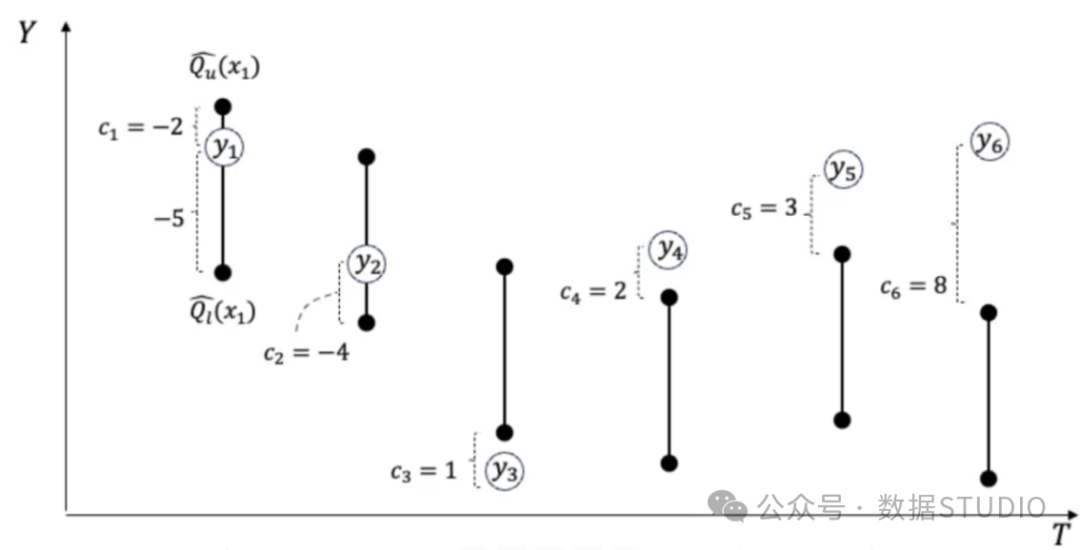 我们以图(A)中的示例来解释等式(1)。假设有六个实际值y1至y6及其相应的预测区间。在第一次预测中,实际值y1的预测区间在下限Ql和上限Qu之间,而y1更接近上限QU。每个预测区间都会有一个一致性得分。根据公式(1),第一个预测值c1的一致性分值为-2,处于-2和-5之间。当y在预测区间内时,一致性总是负数,而当实际值在预测区间外时,一致性总是正数。