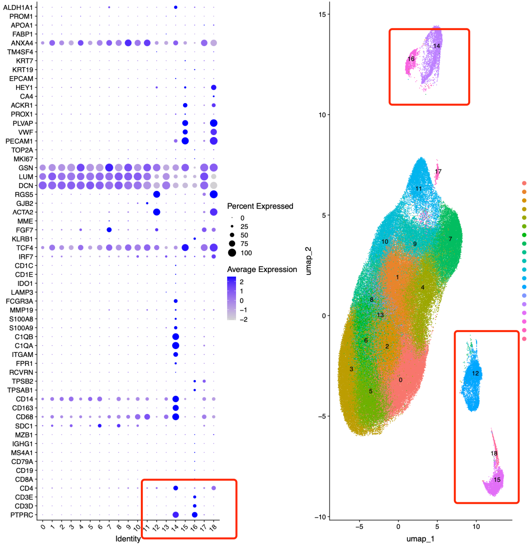 可以看到,里面的14和16是免疫细胞,分别是髓系和淋巴系。而12和15是间质细胞,分别是周细胞和内皮细胞。但是17和18是双细胞,这个需要去看qc图里面的它们的文库大小去确定啦。