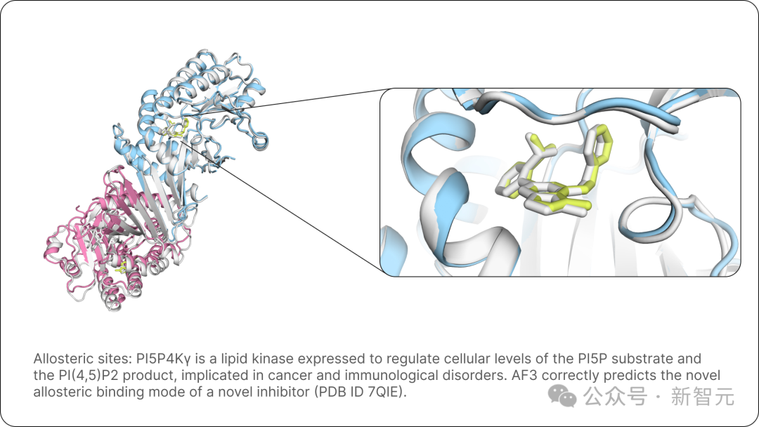 下面是,AlphaFold 3正确预测了一种新型抑制剂的变构结合模式(PDB ID 7QIE)。