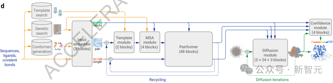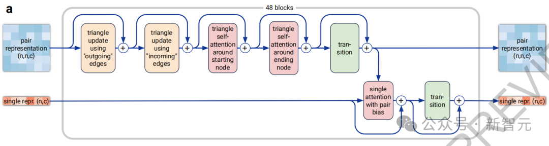 新的「Pairformer」(图2a)取代了AlphaFold 2的「Evoformer」,成为主要的处理模块——只处理成对和单一表征,不再保留MSA表征,所有信息都通过成对表征进行传递。