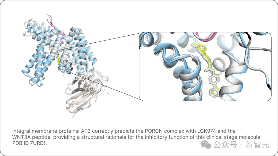 AF3还正确预测了PORCN与LGK974和WNT3A肽的复合物,为临床阶段分子的抑制功能提供了结构依据(PDB ID 7URD)。