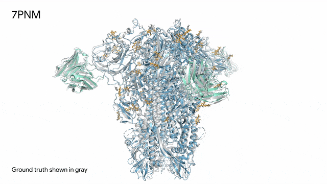 7PNM - 一种普通感冒病毒的突起蛋白(冠状病毒OC43):随着病毒蛋白(蓝色部分)与抗体(绿色)和单糖(黄色)相互作用AlphaFold 3对7PNM的预测结果,与真实结构(灰色)高度吻合。如果进一步了解这类免疫系统过程,我们就能更好地理解COVID-19在内的冠状病毒,改进治疗方法