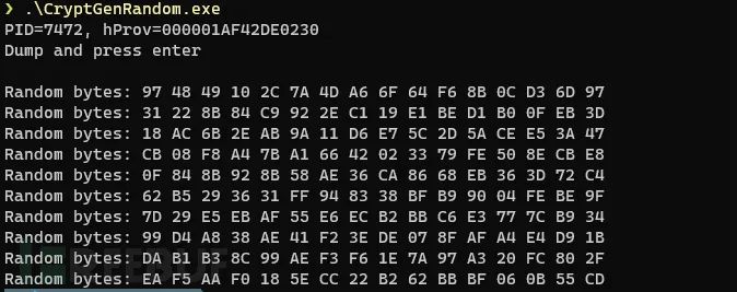 printf("PID=%lu, hProv=%p\nDump and press enter\n", GetCurrentProcessId(), (void *)hCryptProv);