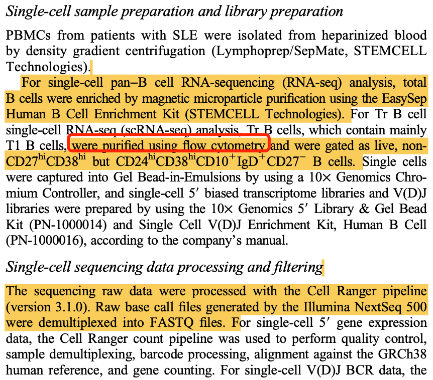 是2022的文章:《IL-4-Induced Quiescence of Resting Naive B Cells Is Disrupted in Systemic Lupus Erythematosus》,也是写的很清楚做了b细胞的流式细胞筛选哦,数据集是GSE136035,如下所示: