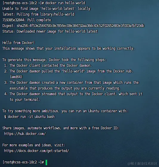 看到docker版本后表示docker已经成功安装了,此时我们可以继续运行hello world的容器,测试容器是否可以正常运行。