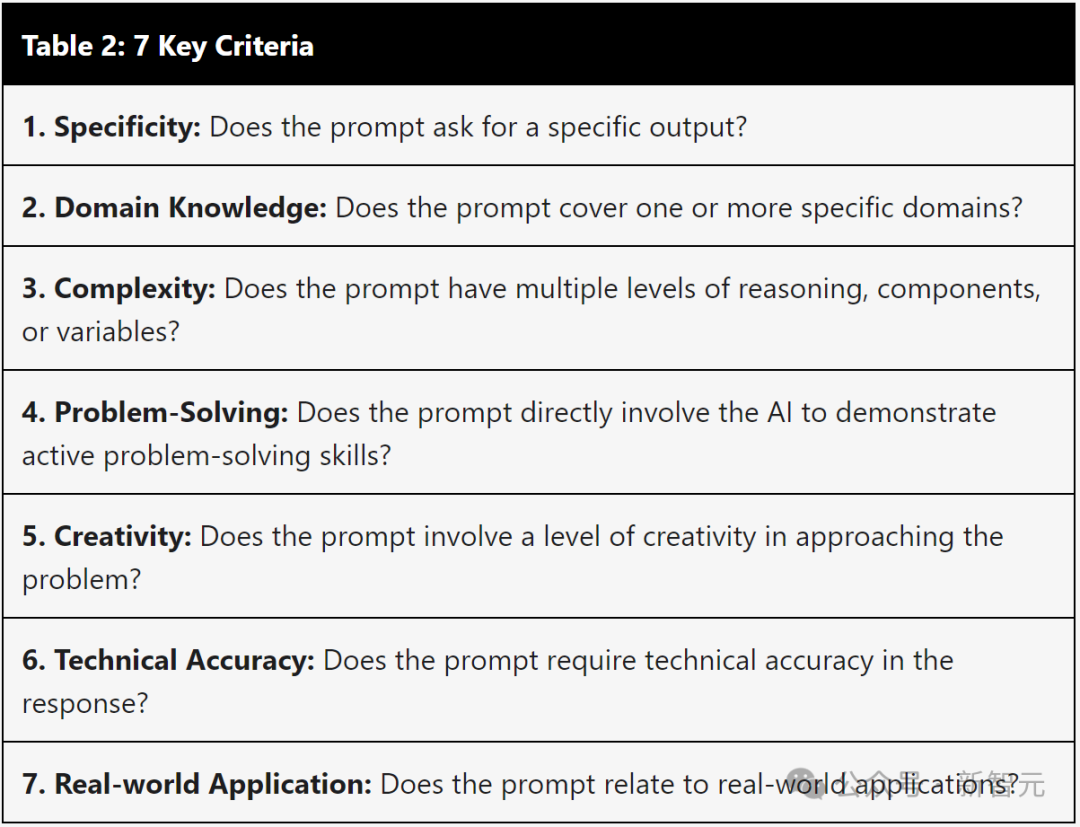 1.提示是否要求提供特定的输出? 2.是否涵盖一个或多个特定领域? 3.是否具有多个级别的推理、组件或变量? 4.是否直接让AI展示解决问题的能力? 5.是否涉及一定程度的创造力? 6.是否要求响应的技术准确性? 7.是否与实际应用相关?