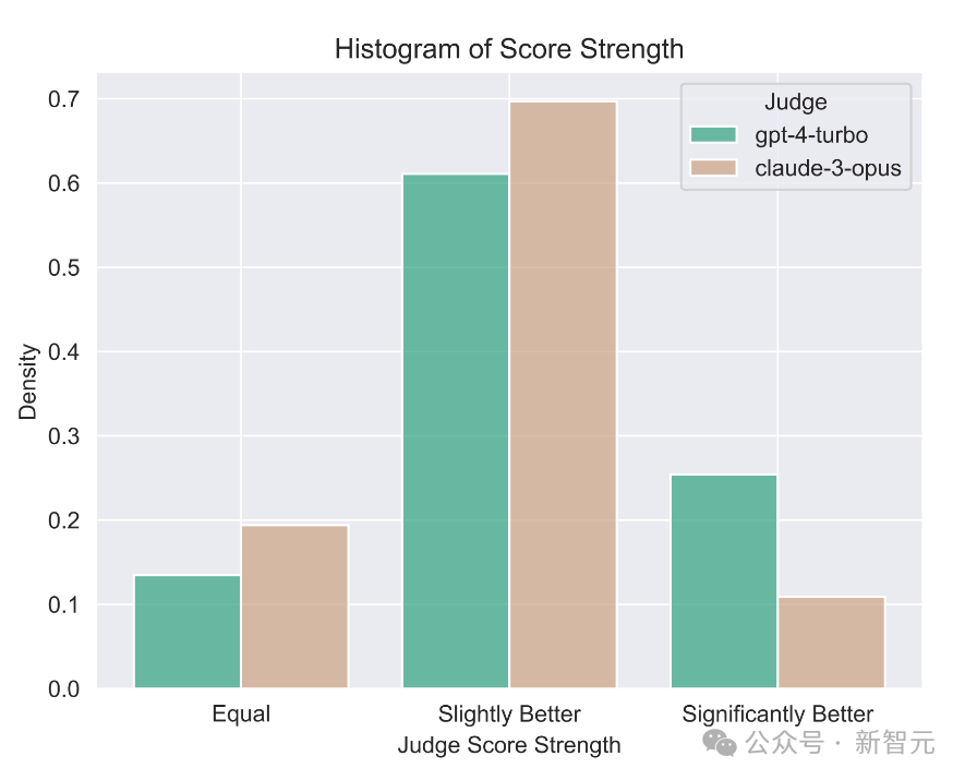 Claude-3-Opus在给分时比较宽容,给出苛刻分数的可能性要小得多——它特别犹豫是否要宣称一个回答比另一个回答「好得多」。