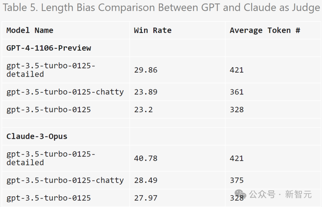 结果表明,GPT-4-Turbo和Claude-3-Opus的判断都可能受到更长输出的影响,而Claude受到的影响更大(因为GPT-3.5-Turbo对GPT-4-0314的胜率超过40%)。