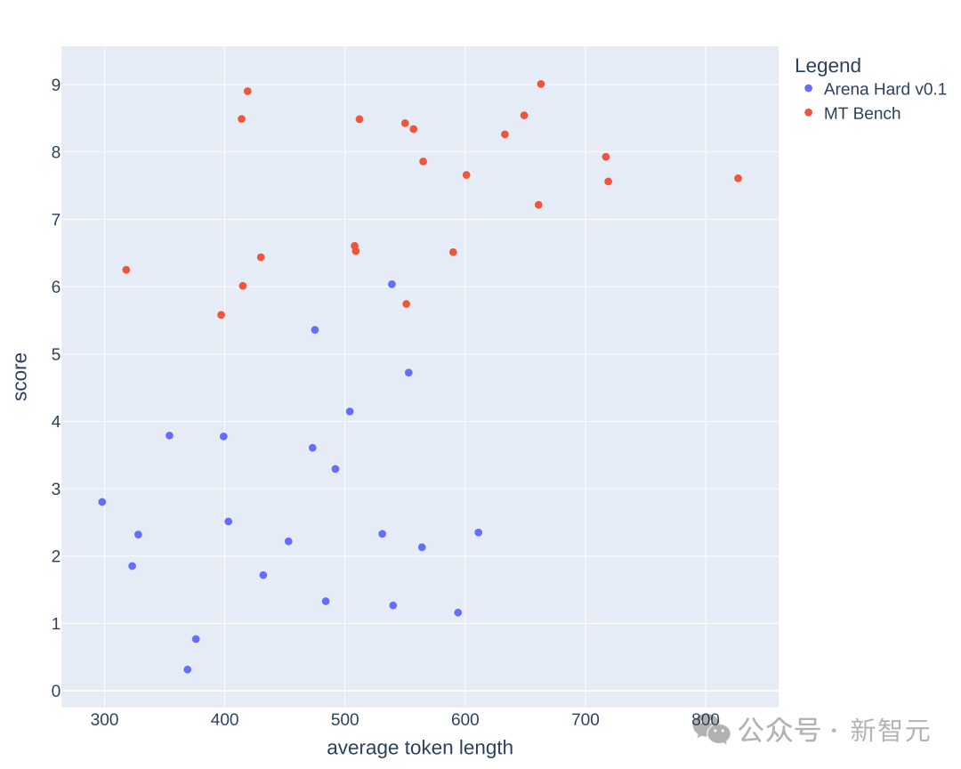 下面绘制了在MT-Bench和Arena-Hard-v0.1上,每个模型的平均token长度和分数。从视觉上看,分数和长度之间没有很强的相关性。