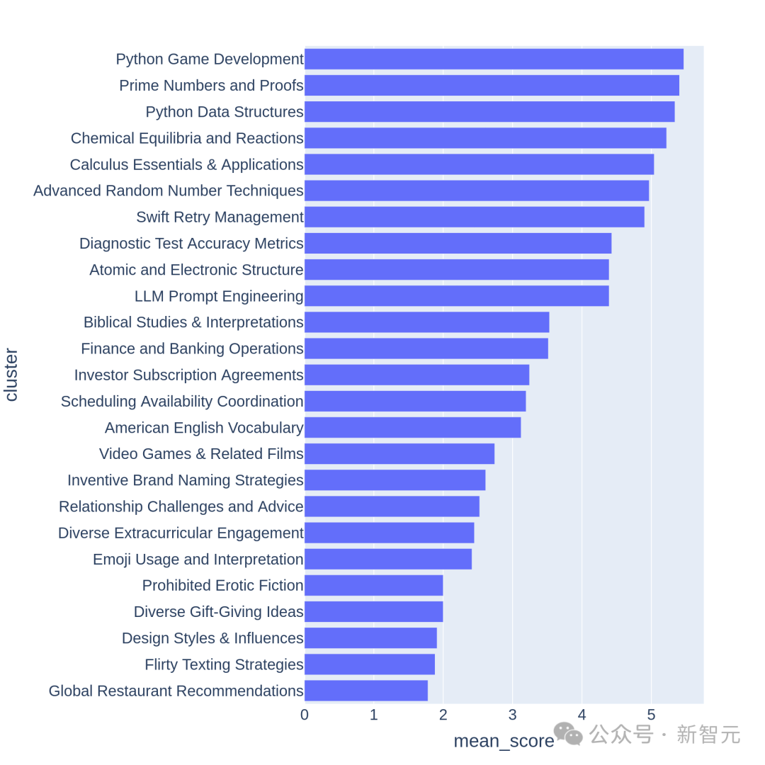 我们可以观察到,得分较高的聚类通常是比较有挑战性的主题(比如游戏开发、数学证明),而分数较低的聚类则属于琐碎或模棱两可的问题。