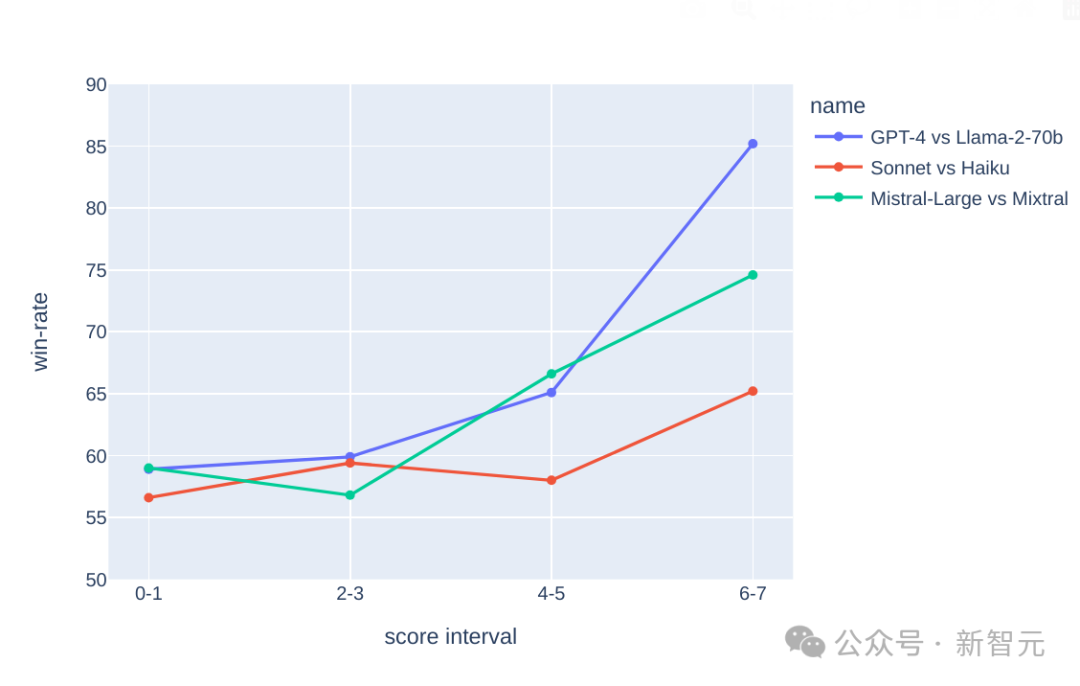 我们可以看到,随着(复杂性)分数的增加,更强的模型的胜率也在提高——学霸获得区分、学渣获得过滤。