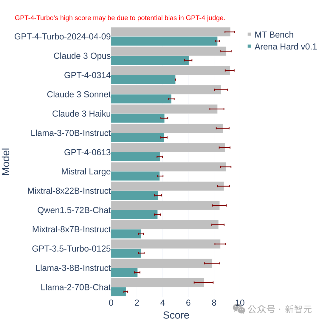 上图中将Arena Hard v0.1,与之前的SOTA基准测试MT Bench进行了比较。