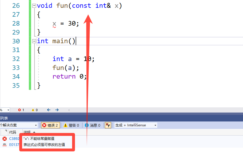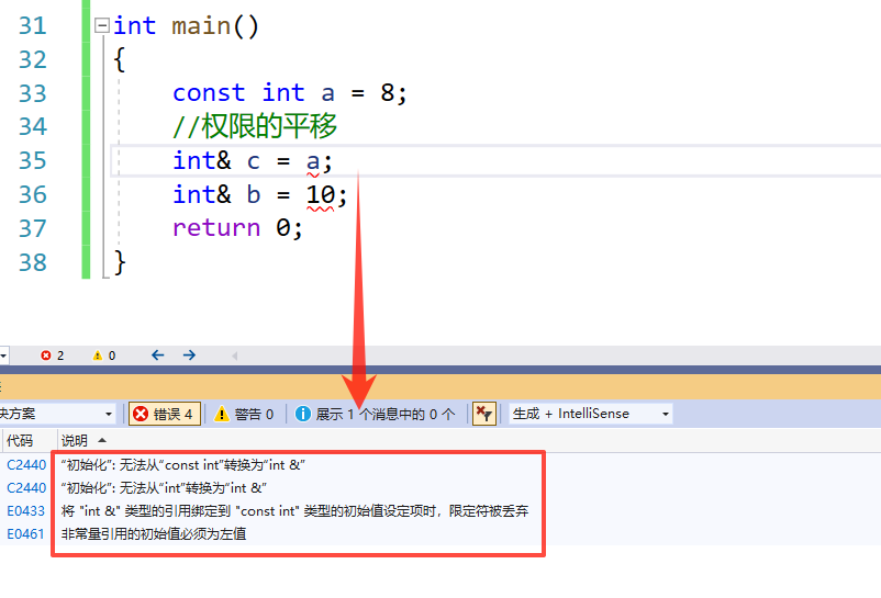 这里我们就把变量 a 的别名 b 的权限缩小了,从可读可写变成了可读,所以我们就不能就行修改了
