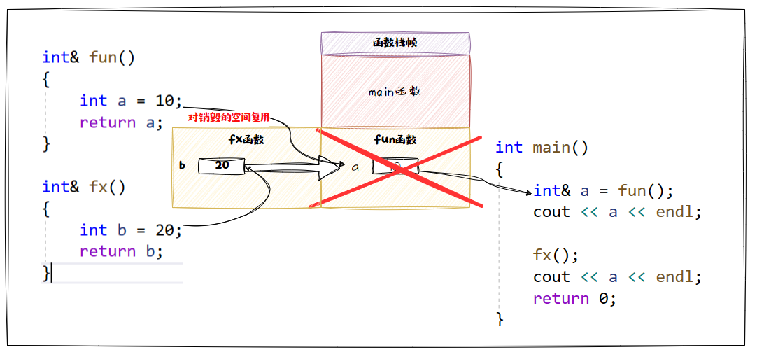 }这里我们就错误的使用引用做返回值的,我们吧函数 fun 里面本来要销毁的变量给使用别名返回了。但是这个快空间本来是要还给操作系统的: