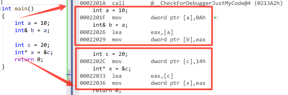 这边我们定义一个指针和引用,然后我们把它转成汇编代码会发现他们来生成的汇编代码是一样的