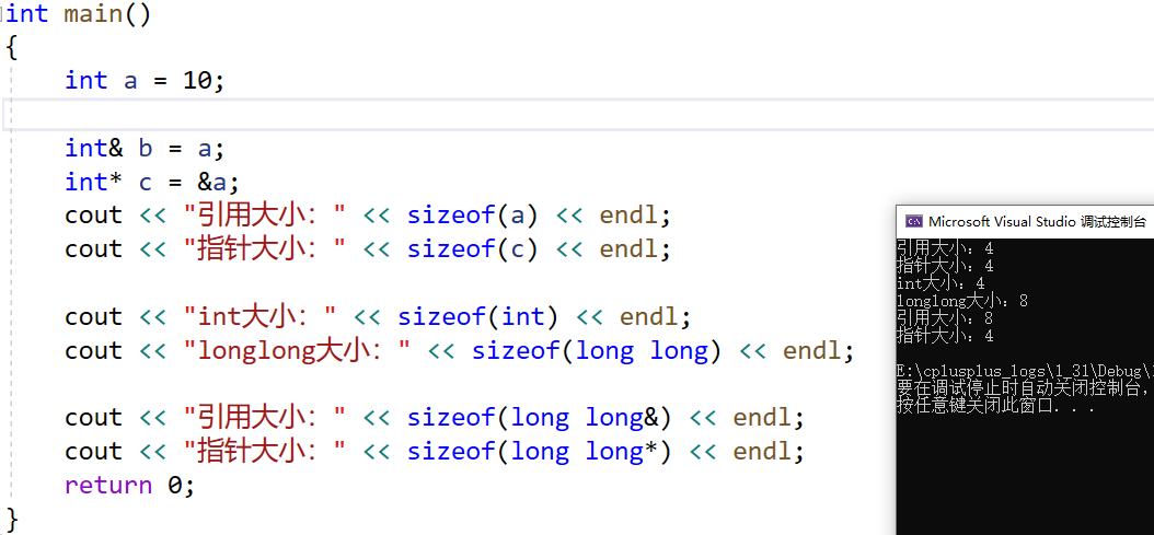 cout << "引用大小:" << sizeof(a) << endl;